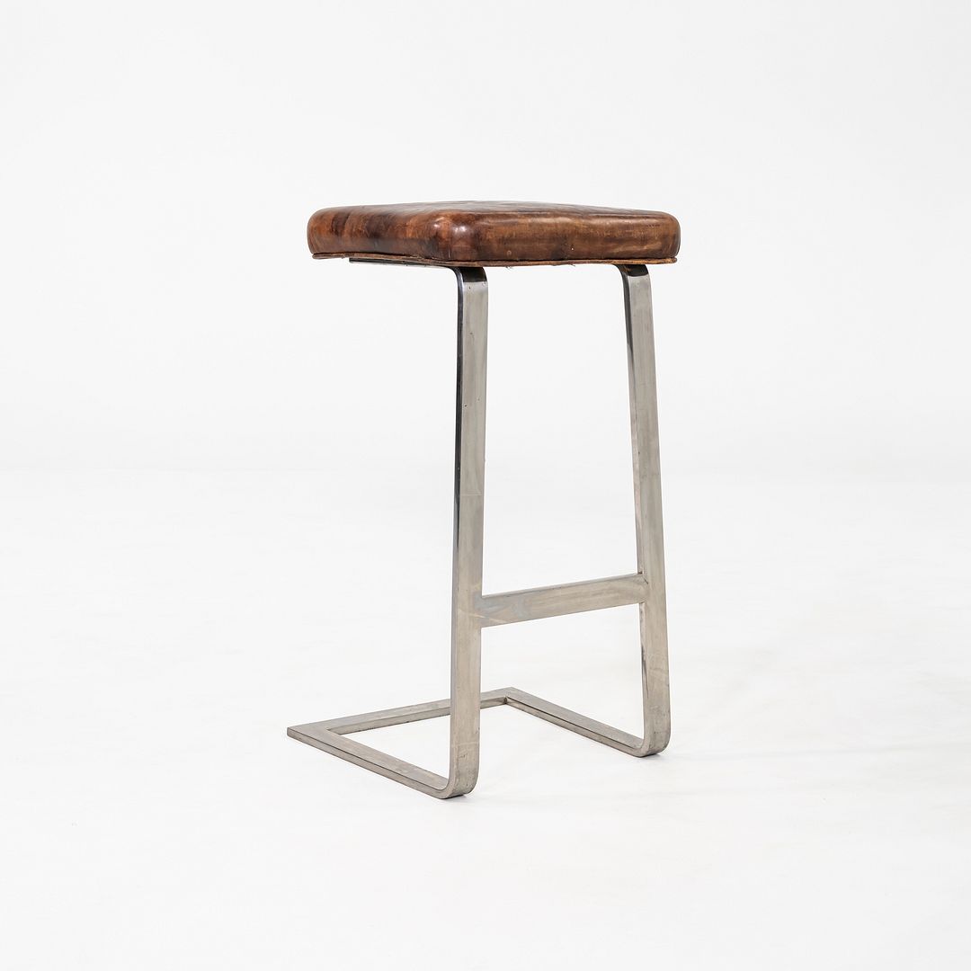 This is an iteration of the ‘Four Seasons’ Barstool, initially designed by Ludwig Mies van der Rohe & Phillip Johnson in 1974. This particular piece was produced by Cumberland Furniture in the USA in the 1980s. The base is slightly different than the initial design in that it was constructed with flat bar steel that is thicker in width than the original specs. The seat of this piece has brown leather upholstery, and it is both sturdy and chic.