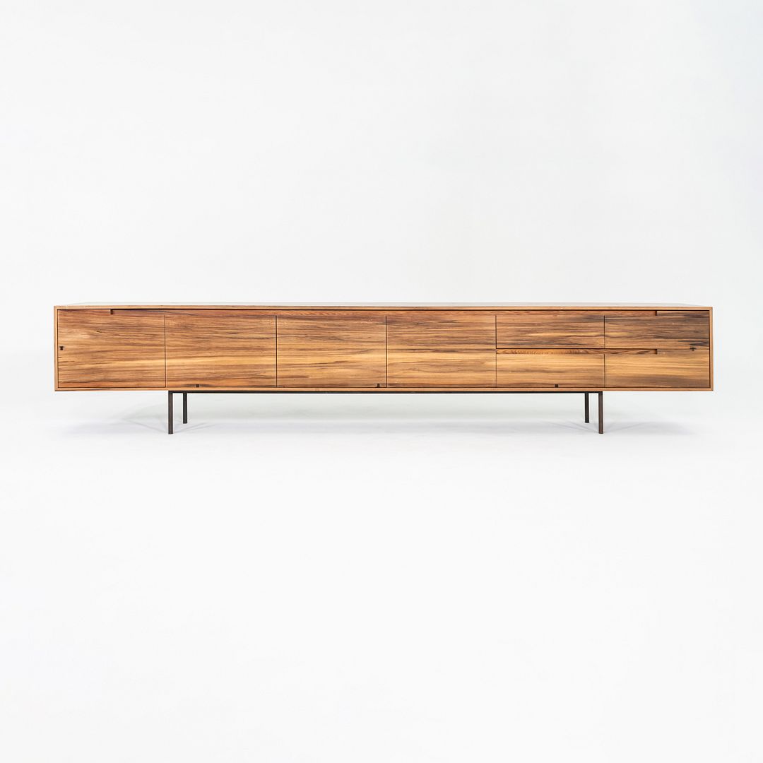 This credenza measures 18.5 inches long, 144 inches wide, and 28.75 inches high. The case itself is in lovely shape, having a handful of surface blemishes that blend in with the myriad hues of the reclaimed wood. The legs show patina and some light rust that was seemingly intended by the designer/maker. Overall, this piece is in very good condition. Please see photos.