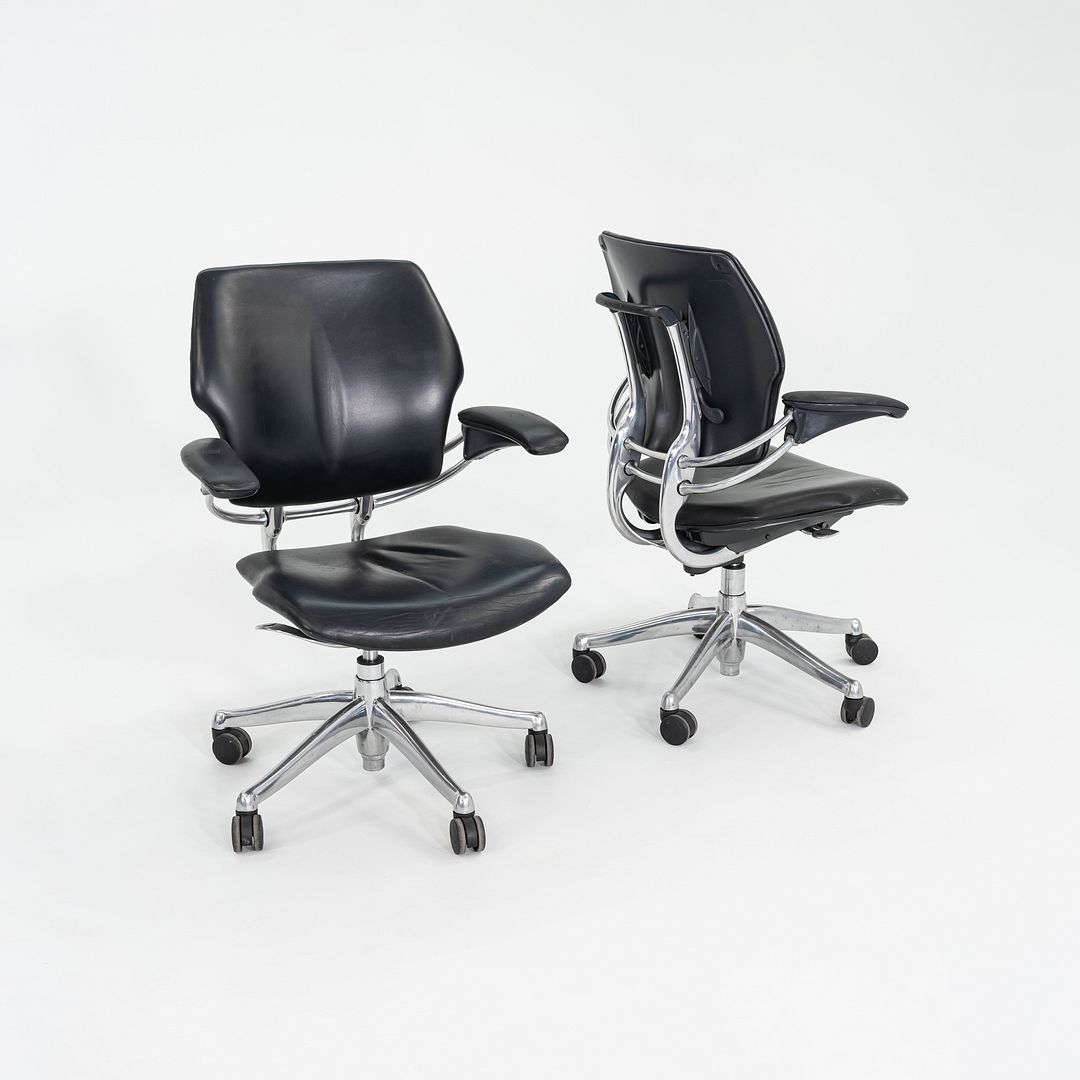These are Freedom Task Desk Chairs, originally designed by Niels Diffrient in 1999. These particular examples were produced by Humanscale in the USA in the 2005. The chairs features an aluminum 5-star base and are upholstered in a black leather. The listed price includes one chair and there are more than 12 available to purchase.