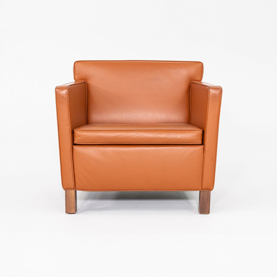 This is a Krefeld Club Chair, originally designed by Ludwig Mies van der Rohe in 1927. This particular example was produced by Knoll in the 2010s. Upholstered in a rich cognac leather, the chair emphasizes Mies’s signature clarity of form and architectural simplicity. It features a tight seat and back cushion that offer structured comfort, all resting atop solid hardwood block feet.