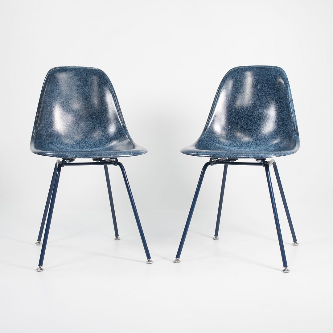 2010s Pair of Modernica Eames Fiberglass Dining Chairs with H Base in Navy Blue