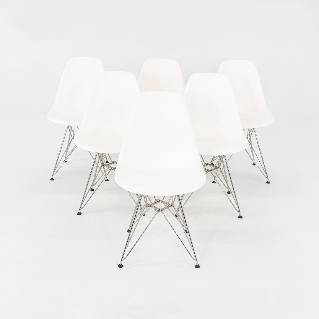 This is a set of six DSR Side Chairs, originally designed by Charles and Ray Eames for Herman Miller in the 1950s. These particular examples were produced in the United States in 2015. Each chair features a white molded plastic shell mounted on a chrome-plated steel Eiffel wire base. DSR is an acronym for Dining Height Side Chair on Rod Base.