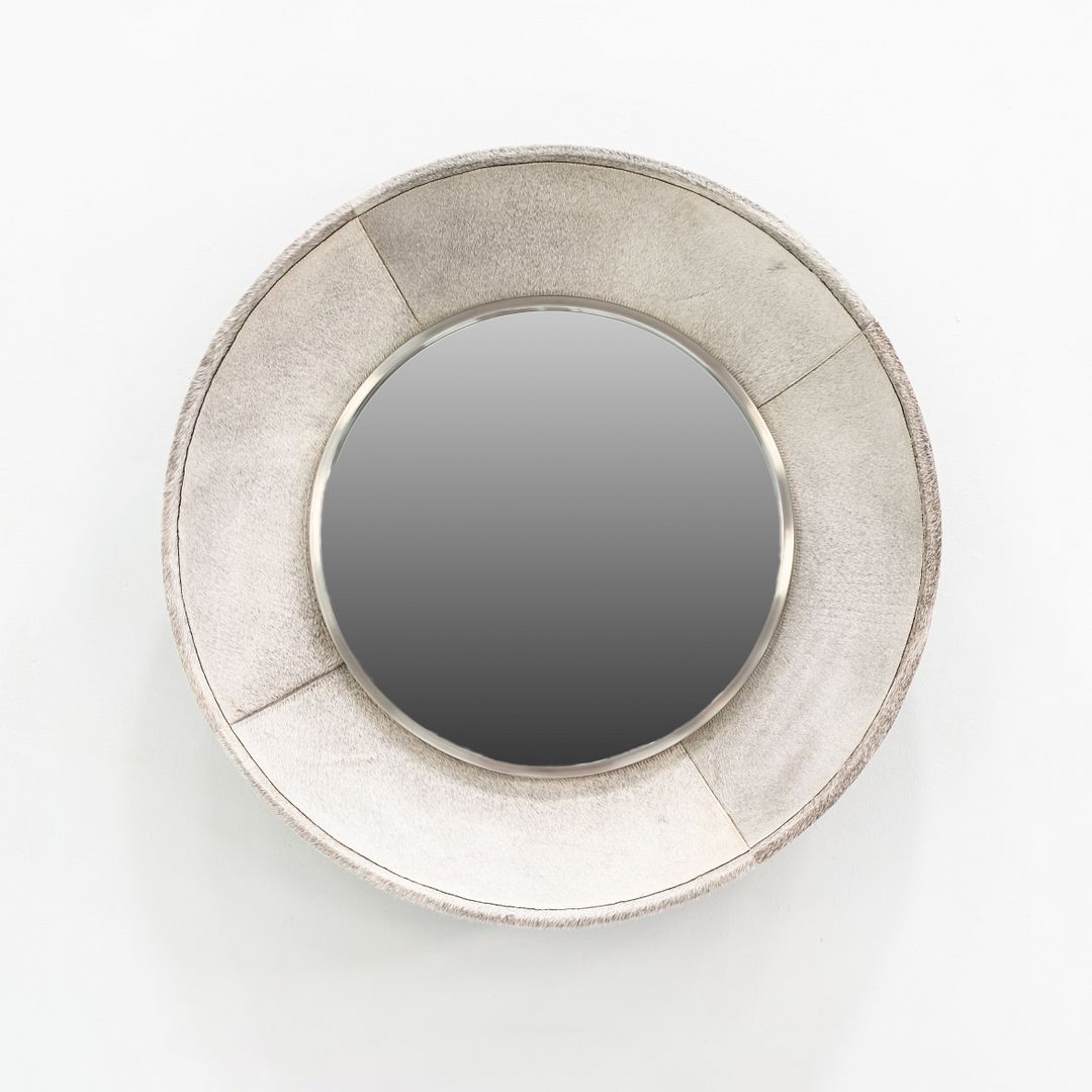 This is a Metro Round Mirror, produced by Studio A Home of Dallas, Texas in the 2020s. The frame is wrapped in high-grade grey hair-on-hide, which lends the piece a rich, tactile quality. A nickel-plated rim borders the beveled center mirror, adding a refined metallic accent that contrasts elegantly with the natural texture of the hide.