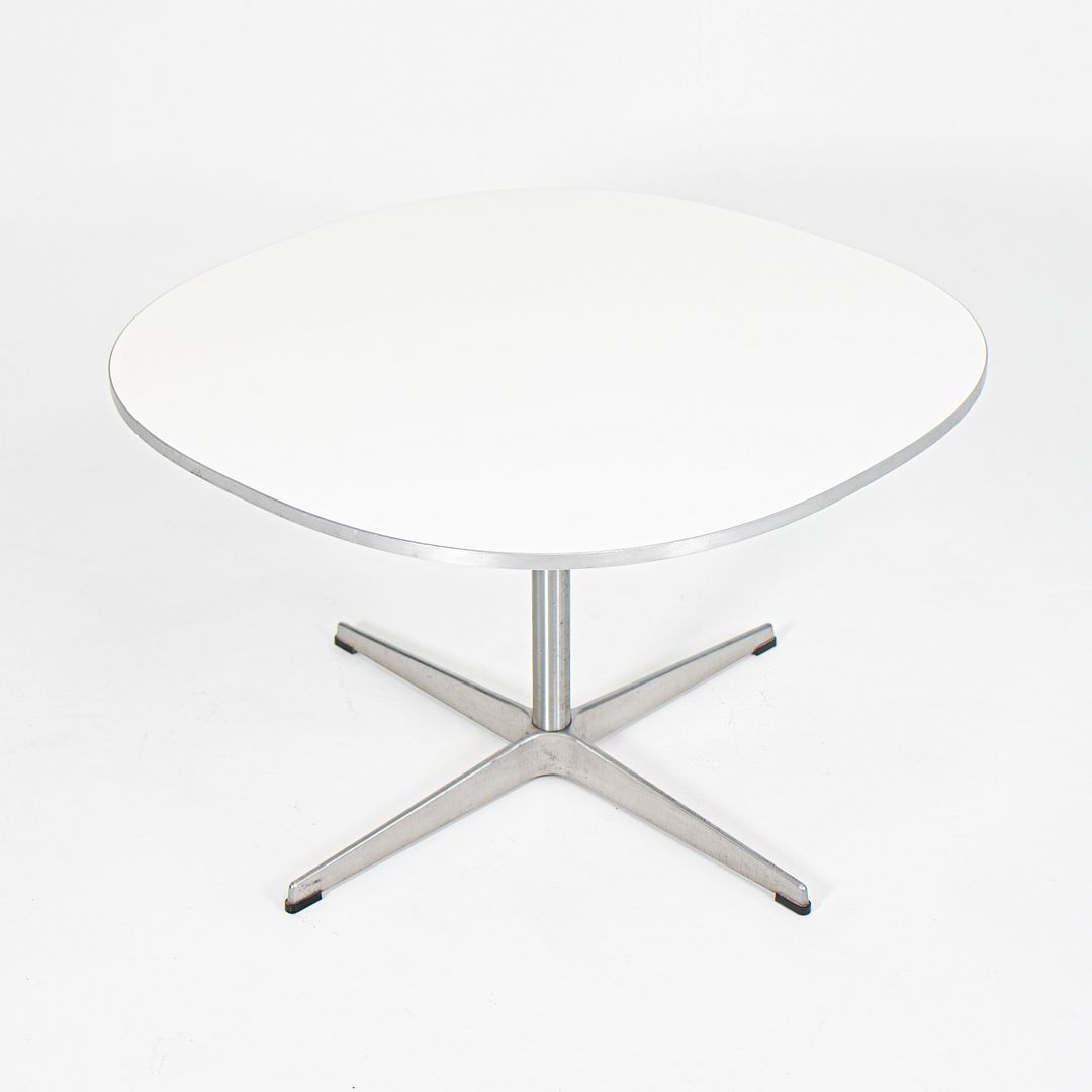 This is a Super-Circular table, Model A603, originally designed by Piet Hein, Arne Jacobsen, and Bruno Mathsson for Fritz Hansen in 1968. This particular example was produced by Fritz Hansen in Denmark C. 2005. The design features a powder coated aluminum base with a white laminate tabletop.
