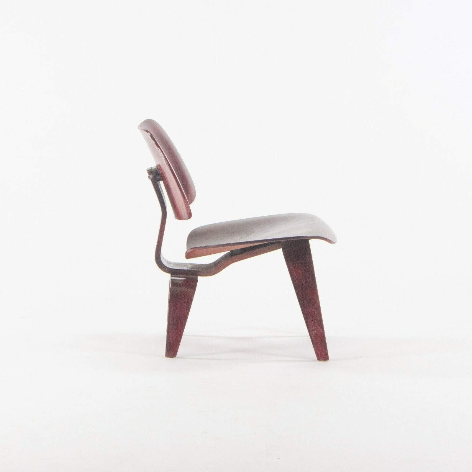 Listed for sale is an original circa 1954 production Eames LCW (Lounge Chair Wood) chair, originally specified in red aniline dye. This example was refinished and restored recently. If interested, we can also have this professionally refinished in an ebonized (black) finish. The chair is in excellent condition structurally. While this is not a museum quality example (due to the refinishing), it is of course an original LCW, which is becoming increasingly rare in any form. This retains its original Herman Miller foil label.