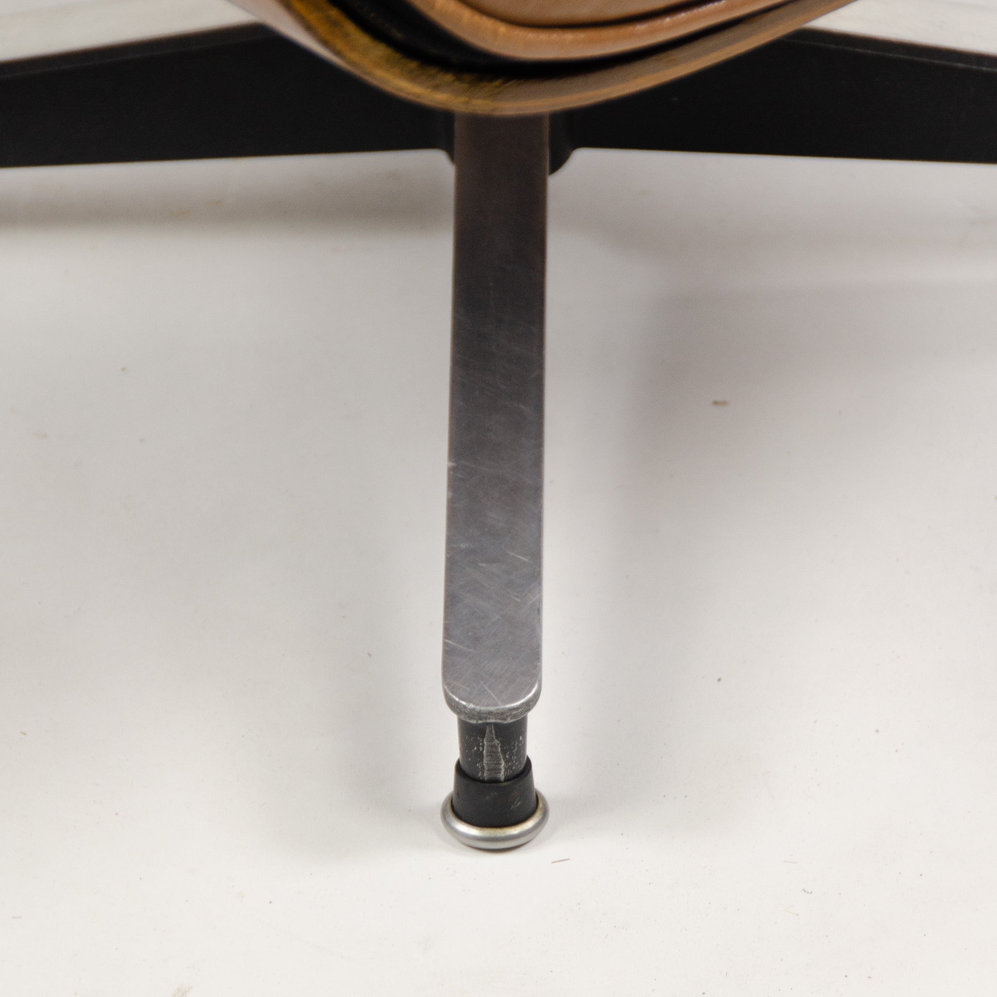 Listed for sale is one of the rarest Eames lounge chairs around. It is a boot glide variation of the 1956 Eames lounge, the first year of production. Even rarer is that it was custom ordered in a tan/natural leather. Almost all of these early examples were black leather with a few brown examples around (and other colors very sparsely). These early sets are fabulously rare and can be identified by a few distinct characteristics.