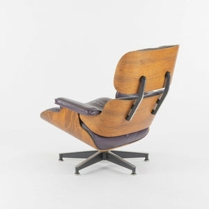 Listed for sale is a 1980s Herman Miller Eames Lounge Chair and Ottoman with original Brazilian rosewood panels and unusual purple leather cushions. This example is in very good original condition. The leather cushions have vibrant purple color, which is consistent throughout. The leather color appears to have been professionally refreshed. There is some wear as noted on the headrest that can be seen in the photos. There are no tears. The armrests also show some wear to the corners, as is typical for chairs of this vintage. The ottoman cushion is in very nice shape and is quite supple. As far as the aluminum bases and parts go, they are in nice condition and shine appropriately. The rosewood panels do not show any major chips or damage. We have not yet oiled these panels and thus, if you would like us to refresh the panels with oil prior to shipping, we can happily do this. Note, this is the exact lounge chair and ottoman that you would be receiving. It is the standard size, as the tall version was not made until the late 2010s.