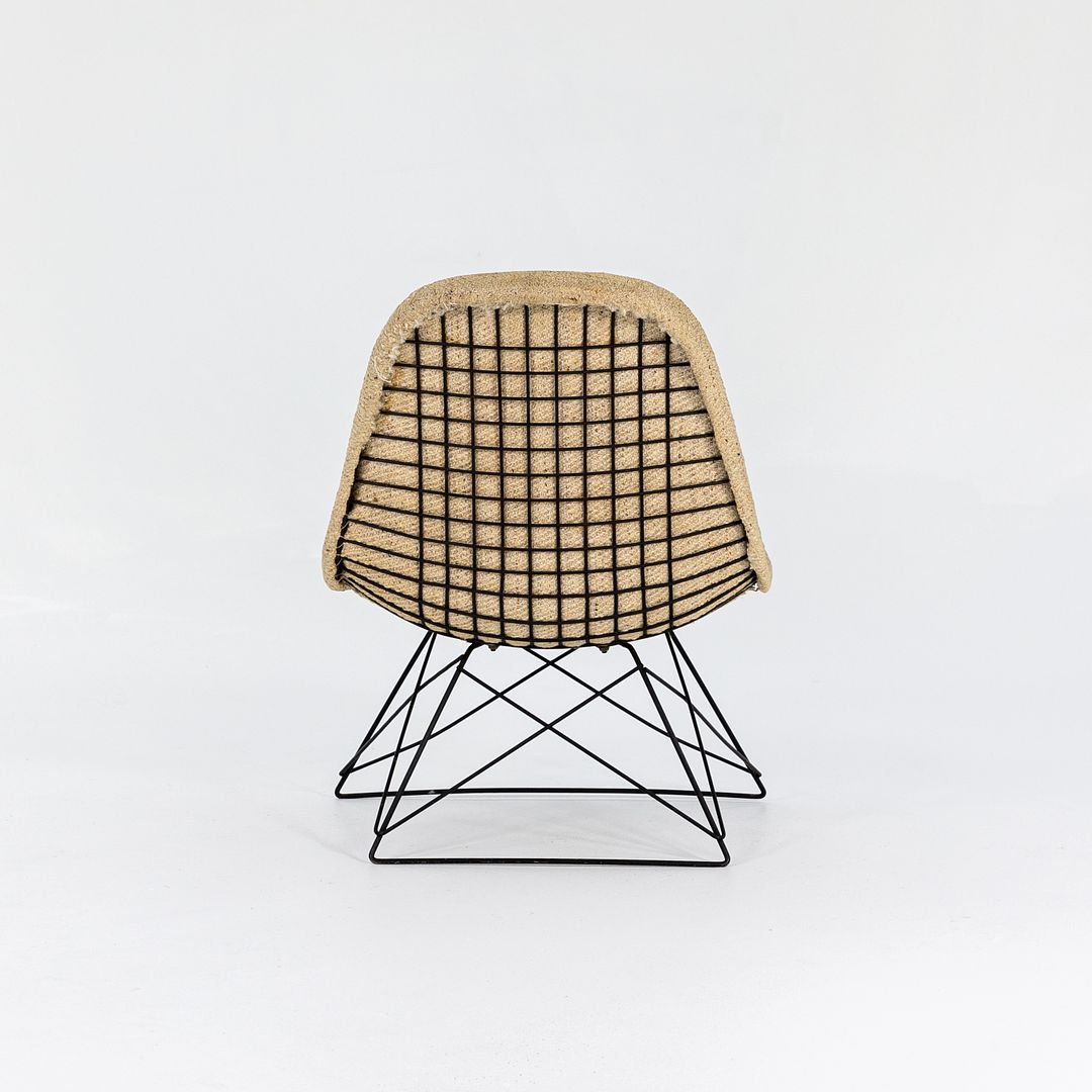 This is a Pair of LKR Wire Side Chairs with Rare “Cats Cradle” Lounge Bases, initially designed by Ray and Charles Eames for Herman Miller in 1951.This pair dates to circa 1953, and the listed price includes the pair as shown. Surprisingly, they retain their original Herman Miller tags. LKR is an acronym that stands for Low (height) K-wire (chair) Rod (base). The bases are composed of steel wire that is coated with black enamel, and the original upholstery is a tan woven fabric.