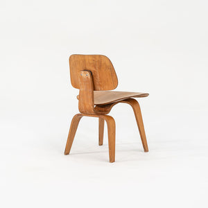 This is a set of four DCW Dining Chairs in Calico Ash, initially designed by Charles and Ray Eames in 1946. These are ultra-rare, early examples that were produced by the Evans Plywood Company circa 1948. One chair retains its original Evans label. One chair was previously drilled through the panel panel, however, we had it sent out to a master woodworker, who did an inlayed veneer repair that makes it barely visible. The other three chairs were untouched.
