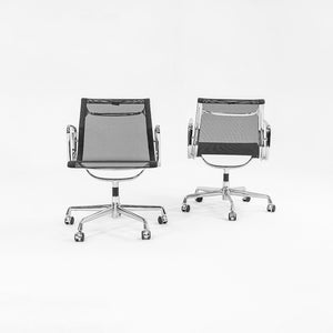 This is an Eames Aluminum Group Management Desk Chair, model EA107, originally designed by Ray and Charles Eames in 1958. This example was produced by Vitra in Germany in the 2000s. The chair is comprised of a 5-star non-swivel base on castors and features a black mesh seat. The listed price includes one chair and there are two available to purchase.