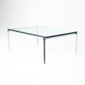 This is a rectangular cocktail table, designed in 1958 by architects William Katavolos, Ross Littell, and Douglas Kelley for Laverne Originals. The table features a chromed-steel frame, and has a tempered glass top. The glass has a greenish-hue to its edge.